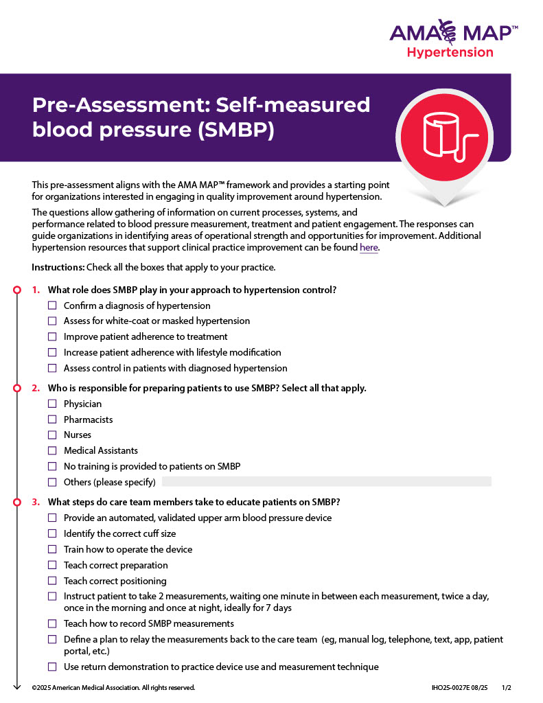 This SMBP pre-assessment aligns with the AMA MAP™ framework and provides a starting point for organizations interested in engaging in quality improvement around hypertension.