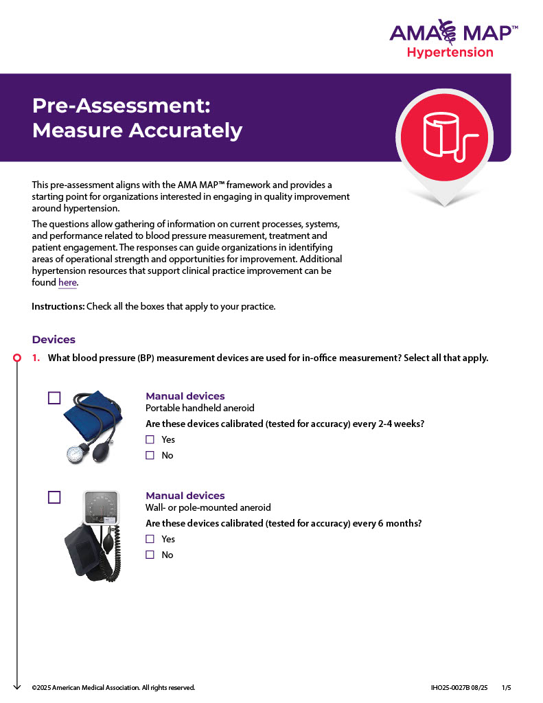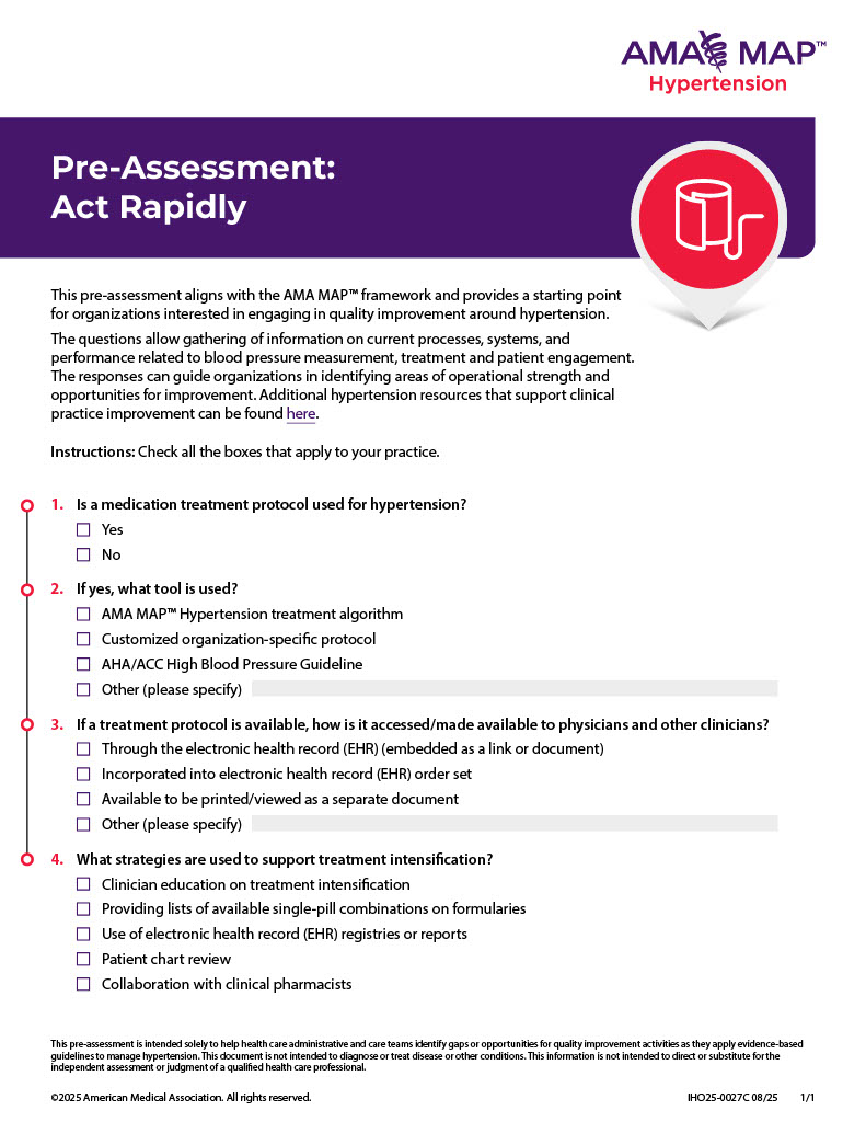 This combined pre-assessment for Measure Accurately, Act Rapidly, Partner with Patients and SMBP aligns with the AMA MAP™ framework and provides a starting point for organizations interested in engaging in quality improvement around hypertension.
