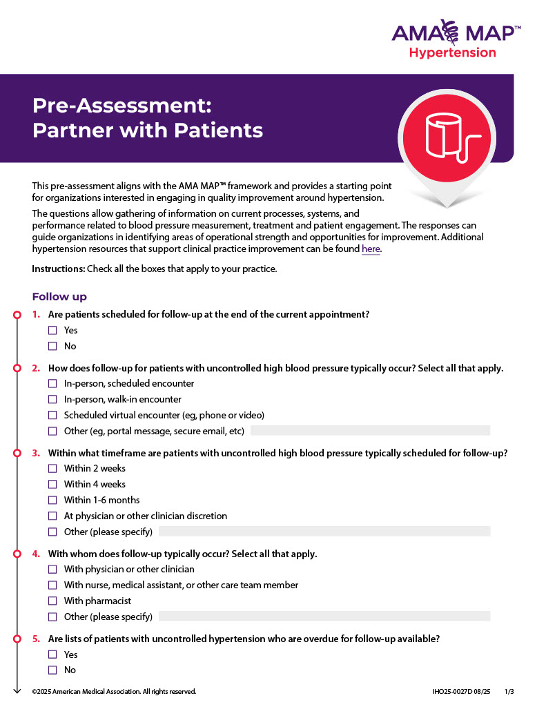 This Partner with Patients pre-assessment aligns with the AMA MAP™ framework and provides a starting point for organizations interested in engaging in quality improvement around hypertension.
